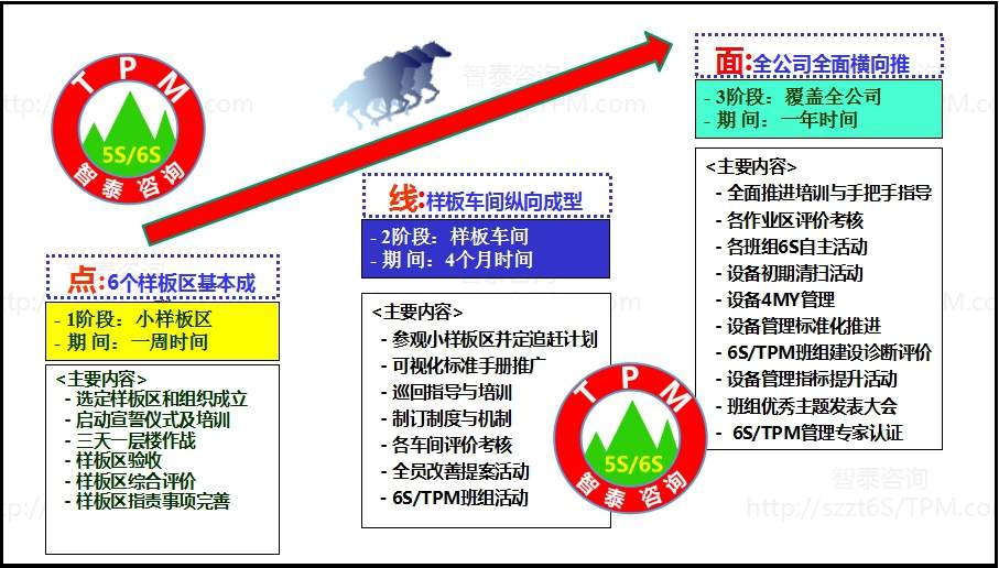 咨詢公司在推進(jìn)6S管理一般是先從點(diǎn)、線、面這種方式進(jìn)行。點(diǎn)就是先做好樣板區(qū)形成標(biāo)準(zhǔn);線就是縱向推進(jìn)至整個(gè)車間形成制度;面就是橫向推進(jìn)至全公司形成文化。