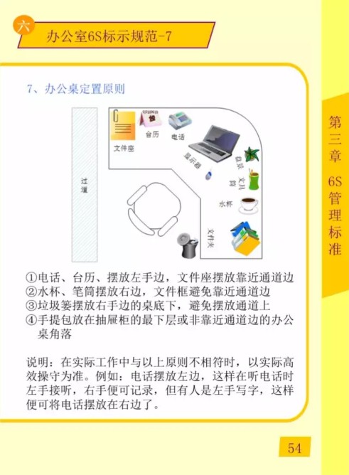 說明:在實(shí)際工作中與以上原則不相符時(shí),以實(shí)際高效操守為準(zhǔn)。例如:電話擺放左邊,這樣在聽電話時(shí)左手接聽,右手便可記錄,但有人是左手寫字,這樣便可將電話擺放在右邊了。