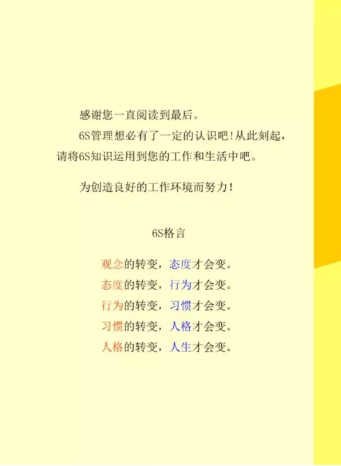 6S管理之素養(yǎng)的要領(lǐng):1.摒棄工作方面的傳統(tǒng)思維方式;2.不要試圖辯解,應(yīng)尋求解決的方法;3.首先,從否定性觀點(diǎn)分析工作現(xiàn)場......