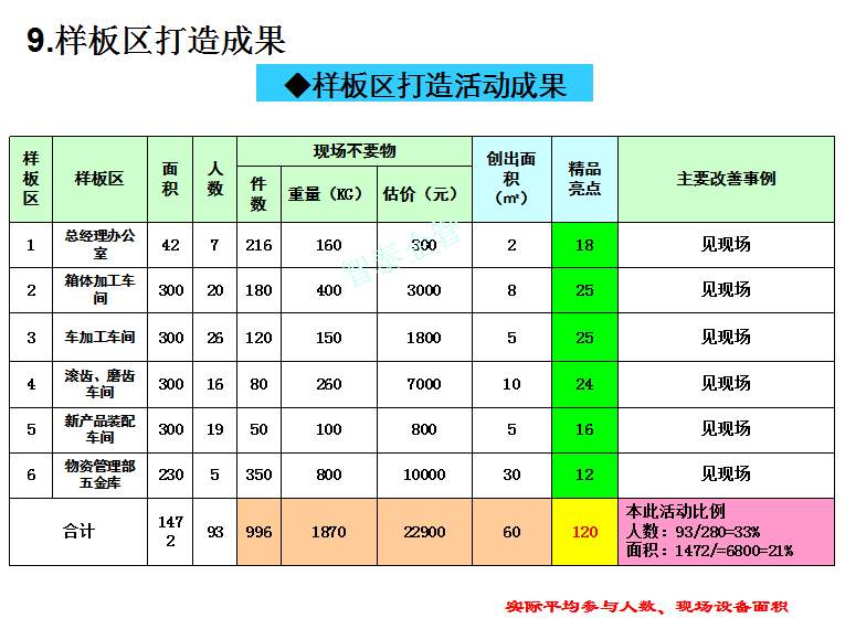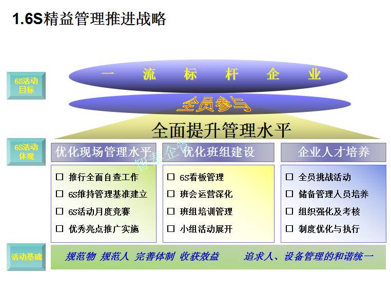 深圳智泰下屬6S咨詢公司在國(guó)內(nèi)對(duì)不同行業(yè)推進(jìn)6S管理,98%以上取得非常滿意的效果,智泰專業(yè)團(tuán)隊(duì)三天為企業(yè)打造成功6~8個(gè)標(biāo)桿車間,6S咨詢公司快速為企業(yè)達(dá)成6S管理目標(biāo)而努力奮斗,企業(yè)要想成為行業(yè)的標(biāo)桿,必須持續(xù)推進(jìn)現(xiàn)場(chǎng)管理,比如6S或TPM管理等,現(xiàn)場(chǎng)管理好的企業(yè)不一定是標(biāo)桿企業(yè),但標(biāo)桿企業(yè)的現(xiàn)場(chǎng)管理一定是優(yōu)秀的。附件為企業(yè)6S管理推進(jìn)總結(jié)內(nèi)容,請(qǐng)查閱: