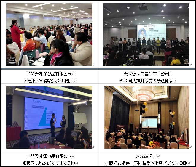 ★ 曾給尚赫天津保健用品有限公司員工講授《會議營銷實戰(zhàn)技巧訓練》、《顧問式銷售邀約技巧》、《銷售贏在溝通》、《顧問式絕對成交5步法則》等系列課程,協(xié)助企業(yè)完成精英團隊的打造,培訓過程采用項目方式,邊培訓,邊領導團隊實施項目改善,經(jīng)過《會議營銷實戰(zhàn)技巧訓練》課程后,團隊學以致用,在實際銷售實踐中,團隊銷售翻翻。在此期間培訓返聘率達到100%。