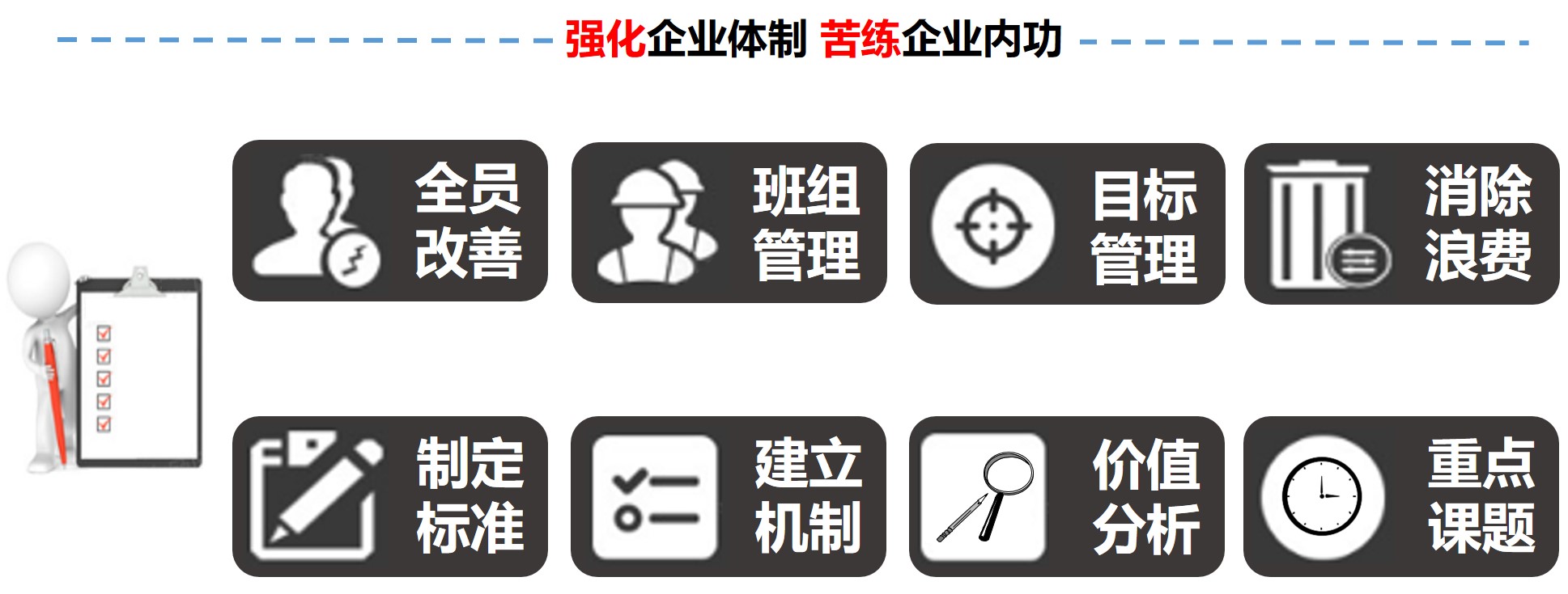 深圳智泰下屬TPM咨詢公司推進(jìn)的TPM管理不僅僅是設(shè)備管理,而是企業(yè)的全面改善,智泰專業(yè)團(tuán)隊(duì)以現(xiàn)場(chǎng)三現(xiàn)為主展開企業(yè)的持續(xù)改進(jìn),幫助企業(yè)提升管理水平,促進(jìn)企業(yè)可持續(xù)發(fā)展,最終達(dá)成行