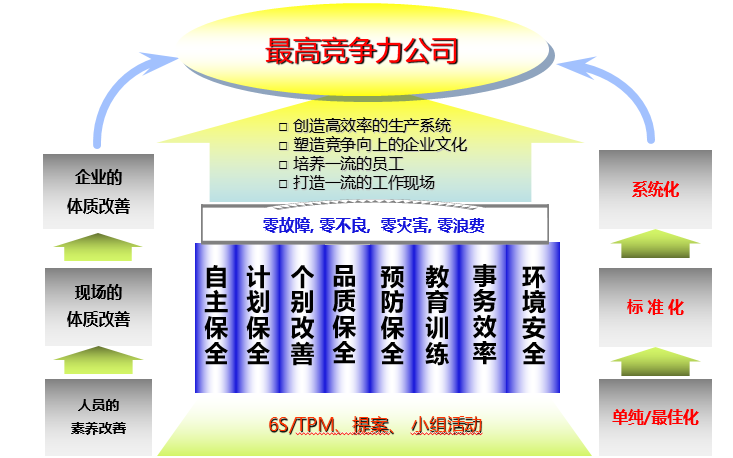 通過不斷循環(huán)的TPM八大支柱活動,持續(xù)的全員參與6S/TPM,提案和小組活動,把企業(yè)人員的素養(yǎng)提升到最佳化,把現(xiàn)場的體質(zhì)改善后要成為標(biāo)準(zhǔn)化持續(xù)管理,對企業(yè)的運營形成制度化和系統(tǒng)化,企業(yè)必定會成為行業(yè)最高競爭力的公司。
