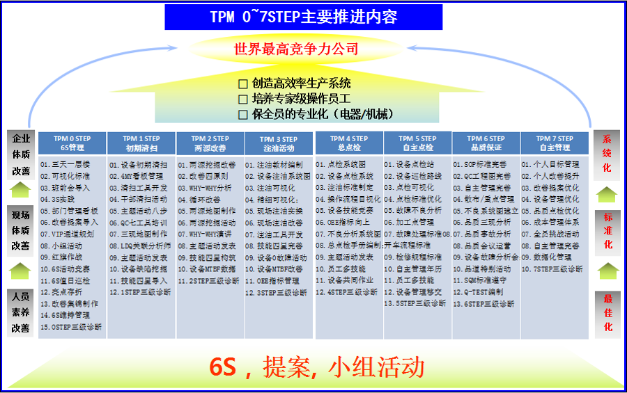 TPM 7 STEP是自主管理:通過持續(xù)的TPM各STEP的活動,員工綜合素養(yǎng)和能力達(dá)到最佳化,前期標(biāo)準(zhǔn)化內(nèi)容形成企業(yè)管理的制度,優(yōu)化各項管理的流程,確保成為行業(yè)最高競爭力的公司。