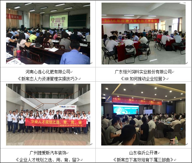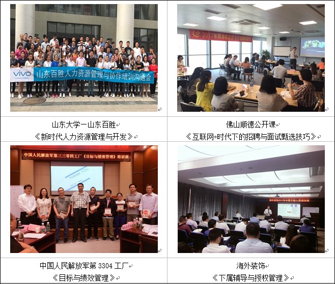 楊老師服務(wù)的客戶遍布北京、天津、上海、深圳、廣州、成都、南京、杭州、武漢、鄭州、沈陽、哈爾濱、長春、長沙、西藏、蘭州、銀川、福州等地200以上企業(yè),為中核工業(yè)集團(tuán)、三星中國、中國移動(dòng)、中國電信、中國聯(lián)通、中鐵建工集團(tuán)、中國重汽、美的集團(tuán)、中國郵政、中國郵儲(chǔ)、中通通訊、中國建設(shè)銀行、中國工商銀行、中國農(nóng)業(yè)銀行、中信銀行、柳工集團(tuán)、陽光保險(xiǎn)、華美集團(tuán)、中通通訊、惠豐機(jī)電、建滔化工集團(tuán)、金威啤酒集團(tuán)、富士康集團(tuán)、美的集團(tuán)、巴士集團(tuán)、重慶電工、遵義卷煙、共進(jìn)電子、廣州恒大集團(tuán)、廣州粒上皇食品、廣西路橋集團(tuán)、河南心連心化肥、南寧威寧投資集團(tuán)、南沙海城貨代、順豐快遞、廣東省各地人才交流中心、清華大學(xué)國際MBA教學(xué)中心、武漢大學(xué)干部培訓(xùn)中心、華中科技大學(xué)MBA教學(xué)中心、華東理工大學(xué)培訓(xùn)中心、蘭州大學(xué)研究生院、河北工業(yè)大學(xué)、廈門大學(xué)、上海交通大學(xué)、西南交通大學(xué)干部培訓(xùn)中心等多家高校EMBA班授課和多家大中型企事業(yè)單位進(jìn)行中、高層領(lǐng)導(dǎo)加力與管理技能、人力資源管理技能及職業(yè)素養(yǎng)提升、陽光心態(tài)培訓(xùn)超700余場次。