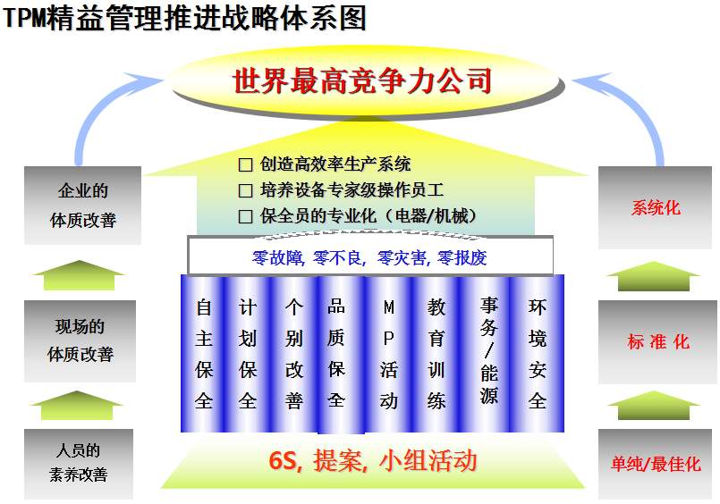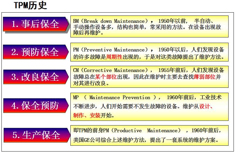 TPM咨詢公司中對(duì)于TPM管理的解釋是英文Total Productive Maintenance的縮略語,中文譯名叫全員生產(chǎn)維護(hù),又譯為全員生產(chǎn)保全:《T (Total)全員 所有部門全員參加的意思;P (Productive)生產(chǎn) 效率提升追求故障 0 化, 不良 0 化, 災(zāi)害 0 化,浪費(fèi) 0 化;M (Maintenance)維護(hù)(保全) 追求極限效率為目的生產(chǎn)體系維持理想狀態(tài)的活動(dòng)》。這是日本人在70年代提出的,是一種全員參與的生產(chǎn)維護(hù)方式,其主要點(diǎn)就在“生產(chǎn)維護(hù)”及“全員參與”上。通過建立一個(gè)全系統(tǒng)員工參與的生產(chǎn)維護(hù)活動(dòng),使設(shè)備性能及員工綜合技能達(dá)到最優(yōu)。TPM咨詢管理的提出是建立在美國的生產(chǎn)維護(hù)體制的基礎(chǔ)上。在非日本國家,由于國情不同,對(duì)TPM的理解是:利用包括操作者在內(nèi)的生產(chǎn)維護(hù)活動(dòng),是以提高OEE(設(shè)備綜合效率)為目標(biāo),以全系統(tǒng)的預(yù)防維護(hù)為過程,全體人員參與為基礎(chǔ)的設(shè)備保養(yǎng)和維護(hù)管理體系。