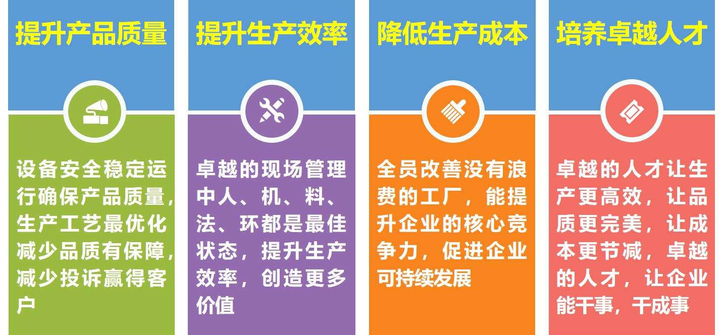 給企業(yè)培養(yǎng)一批熟練掌握6S管理、TPM管理、精益管理、QC七工具、8D改善法等等管理工具的優(yōu)秀人才---確保企業(yè)可持續(xù)高速發(fā)展;